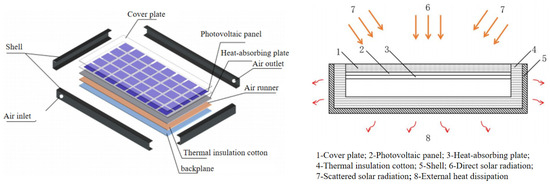 At present, many types of photovoltaic panels have been developed and applied. Considering that the solar energy conversion efficiencies of the separate light–electricity or light–heat utilization technologies are low, PV/T air solar panels, which have a high solar energy conversion efficiency, are widely used. The structure of the PV/T air solar panel is shown in Figure 3, which is mainly composed of six parts: a transparent cover plate, photovoltaic panel, heat-absorbing panel, thermal insulation cotton, backplane, and shell. Its operating principle is mainly divided into two aspects: on the one hand, when the sun shines on the surface of the solar panel, the photovoltaic panel will convert the solar radiation through the transparent cover into direct current electricity, which is stored in the battery through the photovoltaic effect; on the other hand, the heat-absorbing panel absorbs the remaining solar radiant energy and converts it into heat energy, which is transmitted to the working medium (air) in the fluid channel so that the temperature of the cold air entering from the fluid inlet gradually increases, and finally, turns into hot air to take away the heat energy and use it. The specific working principle of PV/T air solar panels is shown in Figure 3.