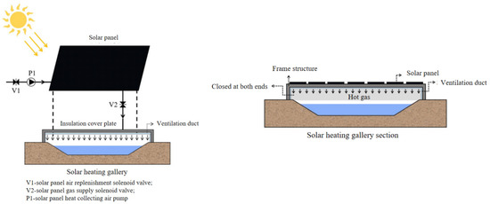 When the solar panel islaid, the solar heating gallery is formed together with the cover plate, air runner, air pump, and other equipment. The solar heating gallery is laid on the channel, as shown in Figure 4. During the operation of the solar heating gallery, the solar panel first absorbs solar radiant energy and converts it into heat energy carried by the heat transfer medium (air). Then, the heated heat transfer medium is transported to the closed structure above the channel through the air runner to improve the temperature of the air layer in the closed structure, thereby increasing the temperature of the water body in the channel and achieving the purposes of temperature increase and temperature control.