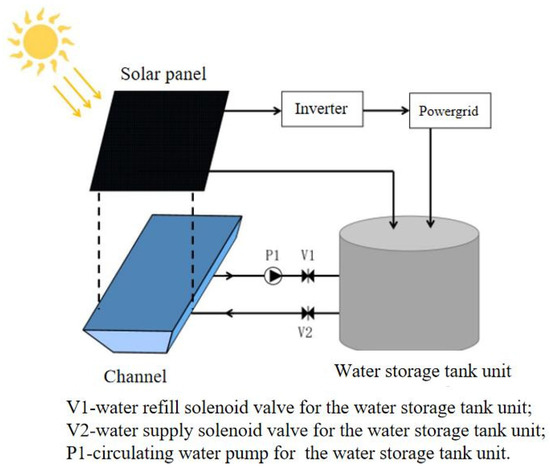 With the progress in the research on thermal insulation material technologies and the development of renewable energy, the use of clean energy such as solar energy and geothermal energy to achieve ice melting in canals has attracted more and more attention [9,10]. In recent years, China has comprehensively promoted the large-scale and high-quality development of wind power and solar power and accelerated the green and low-carbon transformation of its energy system [11]. The United States has adopted ITC and PTC policies to promote the rapid growth of the total photovoltaic installation capacity and vigorously develop renewable energy technologies to achieve the sustainable development of resources [12]. Last year, the European Association released the “Global Solar PV Market Outlook 2021–2025”, which shows the great prospects of solar energy and other renewable energy developments [13]. People are beginning to turn their attention to the integration of water conveyance projects and renewable energy. As shown in Figure 2, the photovoltaic panel is laid on the water conveyance channel. Some researchers [14,15] conducted technical and economic feasibility studies on solar photovoltaic panels installed in water conveyance channels. Ma et al. [16] proposed the multi-objective decision model for the feasibility assessment of WSPV systems of long-distance water conveyance projects and applied it to typical projects in China to demonstrate the effectiveness of the modeling framework, while also exploring the co-benefits of WSPV systems. The University of California, Merced, the Turlock Irrigation District, the Department of Water Resources, and Solar Aquagrid have just entered into a partnership to place solar panels on channels that can benefit from shade through a project called Nexus [17]. To improve the utilization efficiency of solar energy, Wolf [18] first proposed the solar energy utilization technology of the PV/T complementary system in the 1970s. The technology converts part of the solar energy into electricity through solar panels, and then converts the rest of the solar energy into heat energy for power generation, heating, cooling, and seawater desalination. Studies have shown that the solar energy utilization efficiency of the PV/T system can reach 60–80%. In Chow et al.’s [19] review of PV/T technologies, experiments and outdoor studies showed that water-cooled PV/T systems may have a thermal performance comparable to conventional solar thermal collectors. The air-cooled PV/T system provides the possibility for the channel to melt ice during the winter. Rounis et al. [20] conducted experimental studies of single- and multi-entry BIPV/T systems under different climatic and wind conditions, comparing their electrical and thermal performances and photovoltaic temperature distributions. It was found that the comprehensive efficiency of a multi-entry BIPV/T system can reach 63%. Ji [21] combined PV/T photovoltaic panels, insulation cover plates, and ventilation ducts to form a heating gallery and simulated the work of laying in the water conveyance channel by using Fluent 16.0. At the same time, it also optimized the form of the ventilation duct outlets and the pipeline layout. The results showed that the air layer temperature between the water body and the corridor can be greatly increased, and heat loss of the water body can be reduced.