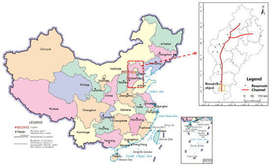 Taking the Zhanghe control gate–Mangniu control gate section in the Hebei section of the middle route of the South-to-North Water Diversion Project as the research object, the total length is 32 . The project’s location is shown in Figure 7. This section mainly passes through HanDan, so meteorological data such as the wind speed, air temperature, and total solar radiation of Handan City from 2000 to 2018 are used. The data are from the National Meteorological Information Center and the National Tibetan Plateau Data Center [34], and the vector data and raster data are from the Geospatial Data Cloud [38] and the National Fundamental Geographic Information System [39].