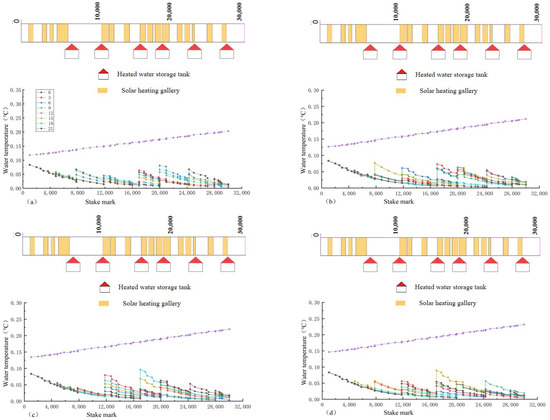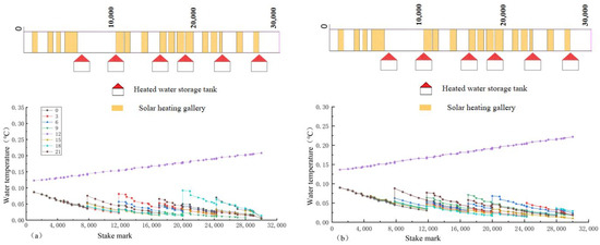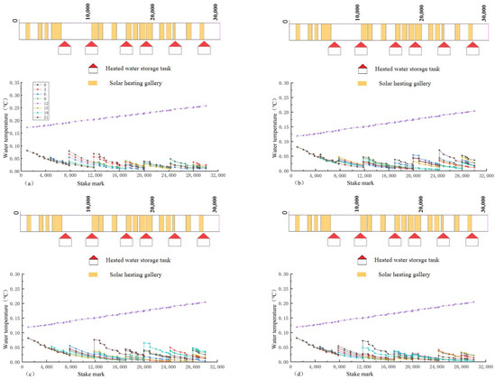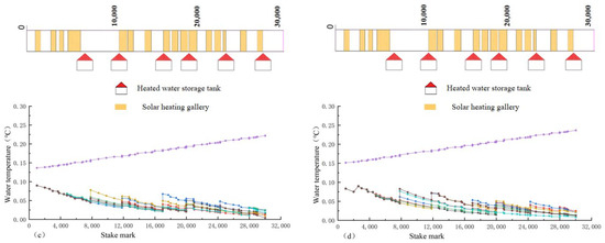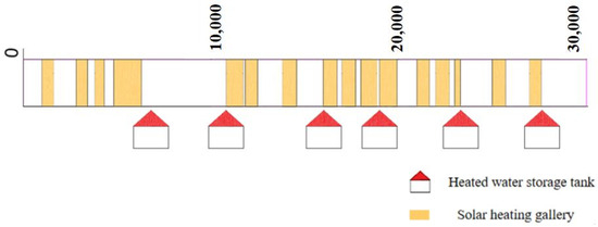 The channel is divided into 34 sections, each of which is about 1000 m, except for special sections. The solar heating gallery and heated water storage tank are laid on the open channel due to the constraints of channel type, construction difficulty, and cost. Among them, six heated water storage tanks and 16.7 km of heating gallery are laid, and their specific positions and scales are shown in Table 1 and Table 2 and Figure 8.