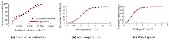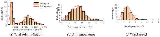 Based on the measured meteorological data of Handan City from November to February of each year from 2000 to 2018, the empirical distribution curves and probability density histograms are drawn, as shown in Figure 10 and Figure 11. Then, Spass mathematical analysis software was used to fit them. After the variance test, it was found that the empirical distribution curves for the air temperature, wind speed, and radiation showed a first-order exponential form, so the ExpDec function model was adopted, and its expression is shown in Table 3. Through a linear regression calculation of the data, we conclude that the multiple correlation coefficient of the wind speed and total solar radiation on the air temperature in Handan City is 0.388, and the probability of corresponding regression model is 0, which is less than the significance level of 0.05, indicating that the linear model analyzed is valid.