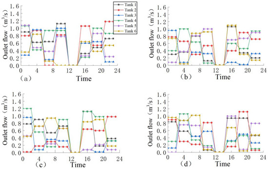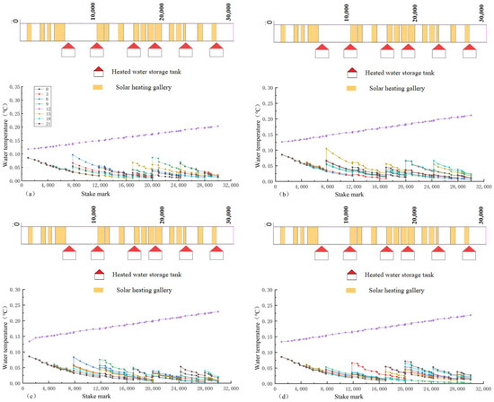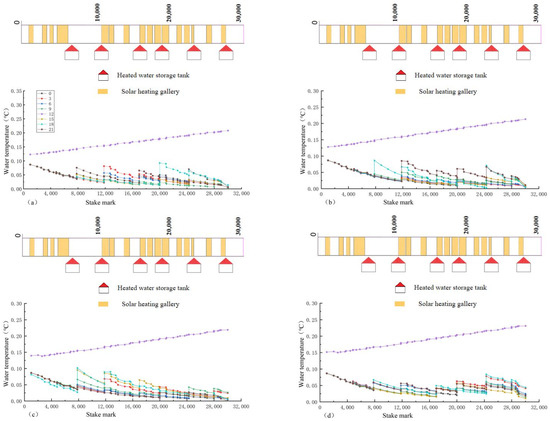where , , , and are the minimum and maximum of the flow and water temperature from the injection point of the heated water storage tank to the channel, and °C; is the initial flow of the channel, ; is the maximum of the design flow for the channel, ; and are the stake numbers at the and points in the channel; is the non-freezing length of the section of the channel due to the channel being redivided, with ice-melting measures as the dividing node,, ; is the number of solar heating galleries; and is the total operating power of all heated water storage tanks, .
