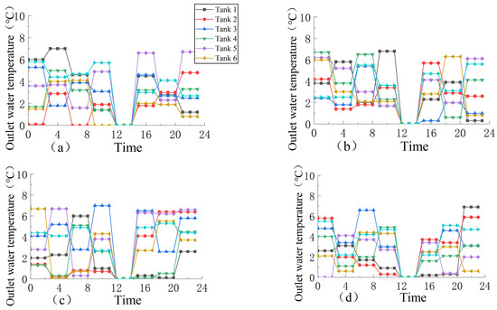- Equation (3) is used to calculate the non-freezing length and node water temperature, so that the length of each redivided channel meets the conditions, then the time–history change curve of the water temperature of the whole channel can be obtained. The constraints on the heating power of the heated water storage tank are as follows: