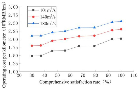 When the installation position and scale of each ice-melting measure are determined, the operating cost of the ice-melting measure under the different comprehensive satisfaction rate can be obtained. According to the heat balance theory, the single heating cost (direct heating using electrical energy in theory) of ice-free water conveyance can be simply calculated initially, and the two are compared, and the specific results are shown in Table 8.