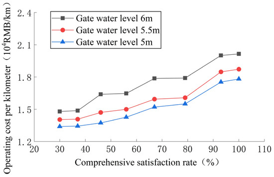 In this section, the concept of a comprehensive satisfaction rate is first introduced, and then in the first part, based on this concept, the optimization regulating process of each ice-melting measure under different comprehensive satisfaction rates is simulated, and the relationship between the satisfaction rate and operating cost is found. Then, in the second and third parts, the optimization regulating process of each ice-melting measure under different water flow rates, water levels in front of the gate, and comprehensive satisfaction rates is simulated. In the fourth part, the relationship between the water flow, downstream depth before the gate, comprehensive satisfaction rate, and operation cost is analyzed, and the corresponding relationship formula is obtained. Finally, in the fifth part, the benefits of each part of the ice-melting measure are analyzed comprehensively, so as to provide technical support for the future development prospects of ice-free water transmission in channels during the winter.