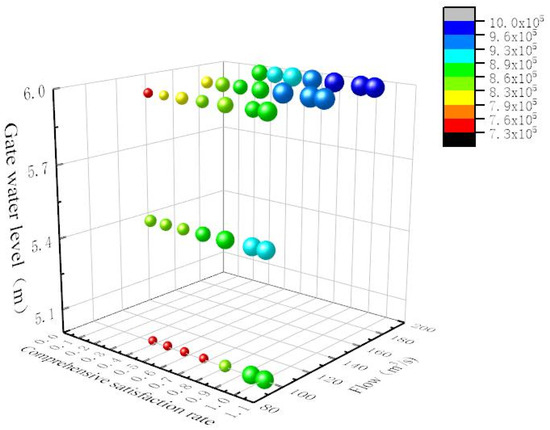 Relationship diagram of four factors: comprehensive satisfaction rate, water flow, downstream depth, and operating cost.