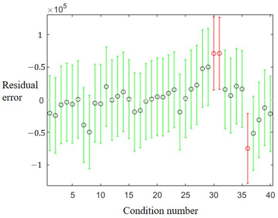 Then, the residual calculation is carried out on the fitting relation, as shown in Figure 26, where the green is the residual range, and the black point is the actual operating cost value. It can be seen from the figure that the error is 92.5% within the reasonable range, which is within the permissible range. To better verify the accuracy of the relationship, five kinds of condition combinations are randomly generated, and their errors are analyzed. The calculation results are shown in Table 7.