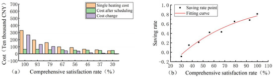 It can be seen from Table 8 that the cost of the two ice-melting combination measures after regulation is lower than that of a single heating cost. With a decrease in the comprehensive satisfaction rate, the change in the cost gradually becomes smaller, indicating that the ice-melting measures can better cope with harsher meteorological conditions. With an improvement in the meteorological conditions, the economic advantages of ice-melting measures will be weakened. To further analyze the variation rules of the satisfaction rate and cost of each combination, the bar chart and the fitting curve of the cost-savings rate were drawn, as shown in Figure 27.