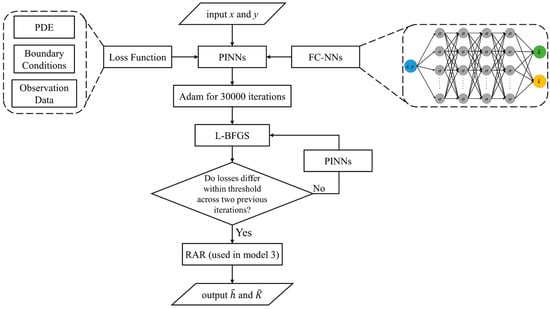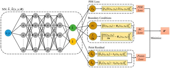 - Construct a PINN with the defined loss function (Equation (9)) and FC-NN. The inputs of the neural network are x and y, and the outputs are h and k.