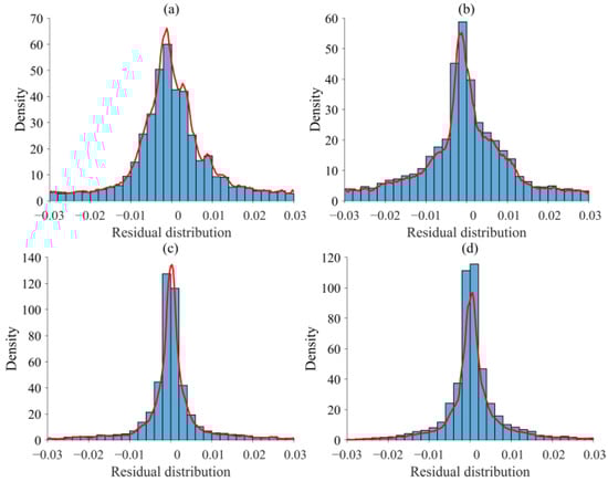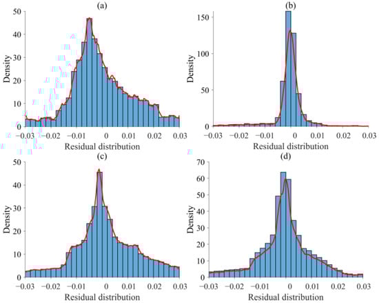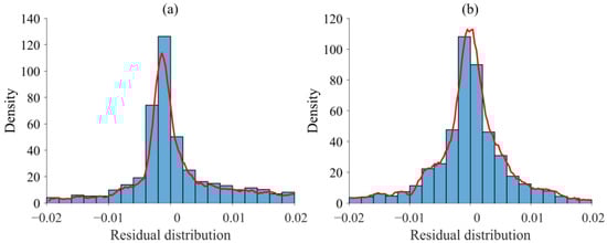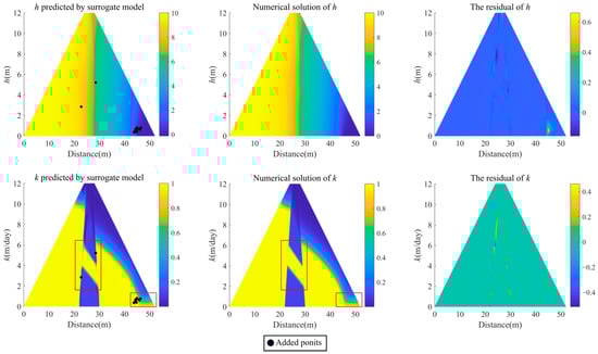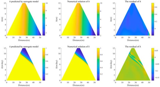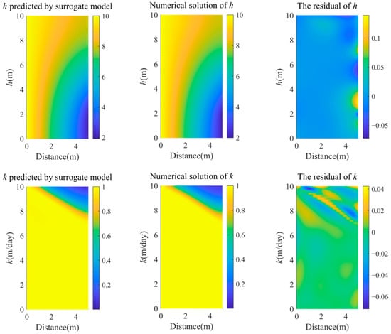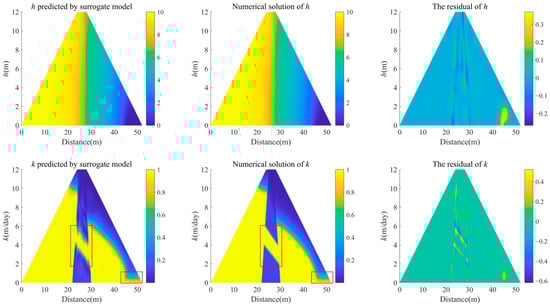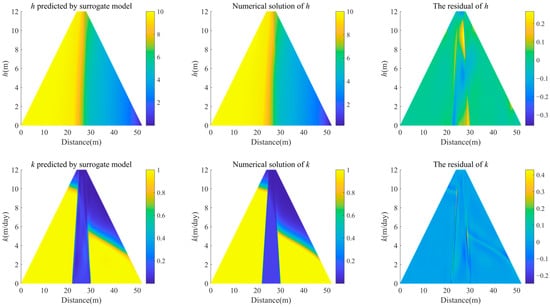 The spatial distribution of high errors is graphically represented on the right side of the Figure 4. As well, Figure 7 shows the density distribution of the residual between the predicted results and the numerical solution. The majority of errors for the h and k predictions are concentrated in the range of −0.01–0.01, indicating a close resemblance between the surrogate model predictions and the numerical solution. The integration of hybrid physical constraints into the trained surrogate model is further confirmed by the analysis of the residual diagram presented in Figure 4. This demonstrates that promising prediction results can be achieved under the hybrid constraints of sparse observation points and numerical models.