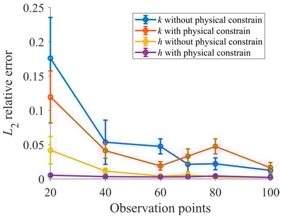Figure 8 shows the surrogate model predictions as compared to the numerical solution. The L2 relative errors between the predicted h and k and the numerical solution are as low as 0.0045 and 0.0133, respectively. These results demonstrate that the data assimilation method based on PINNs can also provide sufficient stability for irregular geometric models.
