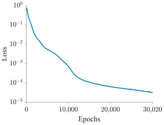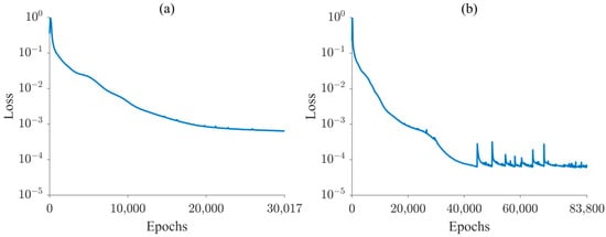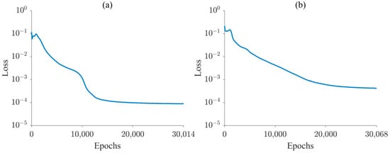 Unlike traditional numerical simulation methods that require fine mesh division for irregular geometries, PINNs possess meshless properties and can be applied to models with arbitrary complex geometries, thus avoiding the need for expensive memory and calculation costs. The proposed methodology does not specify a fixed number of epochs for neural network training. Instead, the training terminates when the loss function reaches a predefined threshold, determined by the specified tolerance (i.e., the difference between the loss function values of two consecutive epochs). Consequently, the number of epochs may differ from one model to another with different structures. As illustrated in Figure 11, employing an equivalent number of training points for model training results in a higher error in the final loss function for the model encompassing a larger number of points in the research domain.