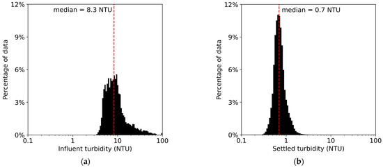 Empirical distribution of the plant’s turbidity in the (a) influent water and (b) settled water.