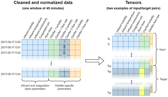 The raw data are converted into a tensor for model training and evaluation. We applied overlapping sliding windows that are 45-time steps in length to create individual examples to include in the tensor. Since flow rate and clarified turbidity are recorded per clarifier, we make multiple examples of the data at each time step that share the five common variables (influent turbidity, influent temperature, influent conductivity, coagulation basin pH, and alum dose) with the unique flow rate and clarified water turbidity for each online clarifier. Each example in the tensor is therefore a 45 × 7 matrix, representing 45 consecutive minutes of measured values for the 7 variables outlined above. Each 45-min data window is turned into two examples, one per active clarifier. The first 30 min of the data includes all variables and is used as input to the model; the last 15 min of the data includes only the clarified turbidity and is the target for the model to predict. Since this approach requires 45 consecutive data points, many examples are removed as they contain an isolated time step that is missing data. This results in a total of 1,539,890 examples in the final data set. This process is summarized visually in Figure 2.