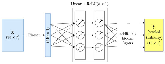 The model receives as input 30 time steps (30 min) of data for all 7 variables described previously, and its task is to predict the evolution of the clarified water turbidity over the next 15 time steps (15 min). These values were selected as the hydraulic retention time (HRT) in the Actiflo® basin at the design capacity is roughly 13 min. Therefore, we provided the model with roughly two HRTs of data as input and tasked it with predicting the effluent approximately one HRT in advance, which should be solely a function of what can already be measured in the system at that time. The model error is calculated as the root-mean-square error (RMSE) during training, according to Equation (2):