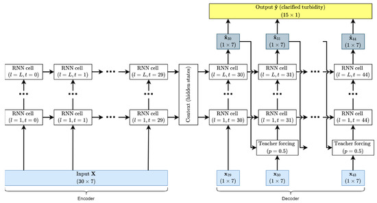 For this study, we tested the RNNs in an encoder–decoder arrangement. In our implementation, the encoder and decoder are an RNN of the same type with the same hyperparameters (number of hidden layers and hidden layer size). This arrangement first encodes the input sequence into a “context” composed of a hidden state and cell state. Each of these states is a matrix with dimensions of (number of hidden layers) × (hidden layer size). The context is then provided to the first temporal layer of the decoder RNN along with the last effluent turbidity value in the input sequence to predict the first effluent turbidity value in the output sequence. This predicted value and the new hidden and cell states are provided recursively to a new temporal RNN layer for the desired number of time steps, illustrated in Figure 4. Note that in this figure, the RNN cells are always of the same type: either LSTM or GRU. Our implementation also uses teacher forcing during training [29], in which the last predicted value may instead be replaced with the ground truth value at the next timestep with probability ; this technique tends to speed up model training by nudging the model into the correct range of output values multiple times during each training step. For both types of RNN we test a grid search of hyperparameters where the number of hidden layers is (2, 3, 4) and the number of hidden units per layer is (32, 64, 128).