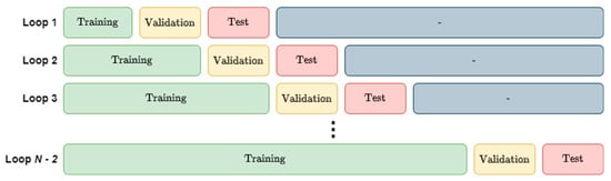 To avoid data leakage and to increase the amount of data available during training compared to using static subsets, we employed a training methodology originally proposed by Snijders [21] and referred to as “blocked cross-validation” (BCV) in [22]. With BCV, those data are not divided into static subsets, but instead these subsets change over the course of training. We start by dividing the data equally into N parts, which we will call blocks and will refer to sequentially as being blocks (1, 2, … N − 1, N). The data are always left in chronological order. We first start by using block 1 as the training set, block 2 as the validation set, and block 3 as the test set. We train the model until it converges (i.e., until the validation error begins to increase), test the model, and record the test error on block 3. We then increase the size of the training subset by 1 block such that blocks 1 and 2 are now the training set, block 3 is the validation set, and block 4 is the test set. This process repeats until block N has been used as the test set. The model’s test error is estimated as the arithmetic mean of the error on all N − 2 test blocks. This strategy is illustrated visually in Figure 5.