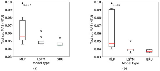 Regardless of the training method, similar patterns are observed in both graphs. The MLPs demonstrate considerably higher variability in model performance than the LSTMs or GRUs. This suggests that hyperparameter tuning (in terms of the number of hidden layers and hidden layer size) is less important for the RNNs than it is for MLP to find an optimal model. However, the best model in each class achieves very similar performance, with an error difference between the three best models trained using BCV and holdout of only 0.02 NTU and 0.05 NTU, respectively. It is notable, however, that GRU consistently has the lowest overall and median errors in both cases.