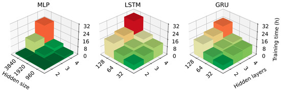 It is notable in the above figure that small MLPs train notably faster than small LSTMs and GRUs. However, as model size increases, this advantage begins to diminish, and in the case of the largest models we trained, GRU had a slightly shorter training time for MLP. This suggests that for larger models than those used here, MLPs would have very long training times, which, coupled with the fact that they also require more hyperparameter tuning, may make them infeasible in such a case.