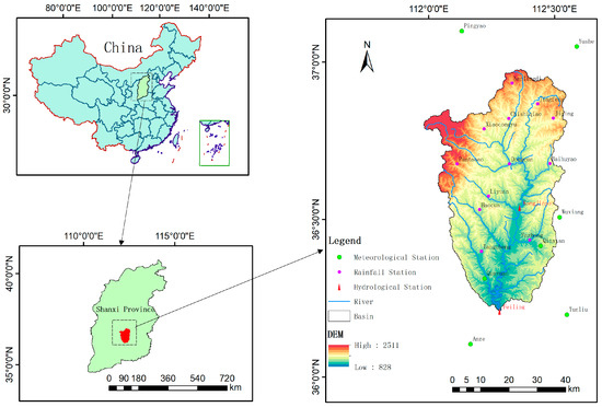 The study area is located in the control basin of the Feiling Hydrological Station of the Qinhe River, geographically located between 111°56′~112°34′ E longitude and 36°12′~36°59′ N latitude. The main Qinhe River in the study area has a length of 137 km, with a watershed area of 2683 km2, a longitudinal drop of 2.9‰, and a watershed shape coefficient of 0.143. The watershed has a continental monsoon climate, with an average rainfall of 597.8 mm, average temperature of 5~11 °C, and average water surface evaporation of 1000 mm. The average sunshine hours are 2314 h, the average evapotranspiration (ET) is 857.61 mm, and the average potential evapotranspiration (PET) is 1688.88 mm [30]. The location map of the study area is shown in Figure 1.