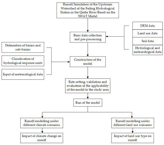 The methodology of this study, as well as the detailed steps of data processing and model application, are visually presented in the following figure. The flowchart meticulously illustrates the entire process of SWAT model construction, from the delineation of watersheds and sub-basins and classification of hydrological response units to the input of meteorological data. Additionally, the model’s parameterization, validation, and the assessment of its applicability to the study area are also depicted. Upon the completion of the model’s run, further simulations of runoff under various climate and land-use scenarios were conducted, analyzing the impacts of climate change and land-use variation on runoff. The flowchart (Figure 2) succinctly summarizes the technical route of this research, facilitating a deeper understanding of the entire research framework for the readers.