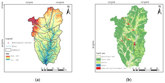 The runoff simulation of the study area was carried out using ARCSWAT, version 2012. For the watershed delineation, the catchment area threshold was set to 10,000 hm2 after splicing the DEM data, filling depressions, calculating the flow direction, and calculating the cumulative catchment area [36]. The Feiling Hydrological Station was used as the outlet of the watershed to divide the entire study area into 20 sub-watersheds and generate the river network and water system of the study area, as detailed in Figure 3a. It is necessary to input the land-use data, soil type data, and slope data when establishing the hydrological response units (HRUs).