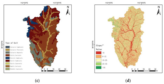 The input soil data were extracted from HSWD’s soil database for the study area and reclassified into nine different soil types, as shown in Table 4 and Figure 3c. Slopes in the watershed were classified into five levels (0–8°, 8–15°, 15–25°, 25–35°, and >35°), as shown in Figure 3d.