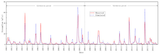 The collected measured monthly mean flow data of the study area watershed were divided into three phases: the warm-up period (1988 and 1989), the rating period (1990–2005), and the validation period (2006–2018). The simulated values of the rate-determined runoff-related parameters were input into the SWAT model for comparison with the measured values. This allowed the model’s simulation accuracy to be assessed, and the results can be seen in Table 6.