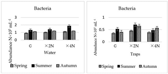 The abundance of bacteria was mostly higher in the water than in the traps in both the ×2N and the ×4N treatments compared to the control. In the water, abundance in both experimental treatments (×2N and ×4N) was highest in summer and lowest in spring. In the traps, the highest abundance in treatment ×2N was noted in summer, while in treatment ×4N it was highest in autumn (ANOVA, F3.33 = 0.546, p = 0.521) (Figure 2).