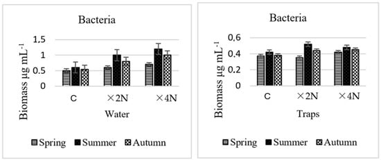 Biomass of bacteria was higher in the water than in the traps, in both treatment ×2N and treatment ×4N. In addition, the biomass was lower in treatment ×2N than in treatment ×4N. In treatment ×2N, bacterial biomass in the water ranged from 0.54 to 1.02 μg mL−1, while in ×4N it ranged from 0.7 to 1.2 μg mL−1. The value of this parameter in the traps was higher in treatment ×2N (0.35–0.65 μg mL−1) than in treatment ×4N (0.4–055 μg mL−1) (Figure 3). In both the traps and the water, an increase in biomass was observed following enrichment of the environment with nitrogen compounds.
