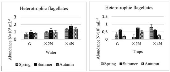 The abundance of heterotrophic flagellates in treatment ×2N was much lower than in treatment ×4N (in both the aquatic environment and the traps). In the water, in treatments ×2N and ×4N the abundance of these microorganisms was highest in summer (Figure 4). In the traps of Utricularia vulgaris, the number of flagellates was much lower than in the aquatic environment, with lower abundance of these microorganisms noted in treatment ×2N than in treatment ×4N. The highest abundance was recorded in summer in treatment ×2N, and in spring in treatment ×4N (ANOVA, F3.30 = 0.687, p = 0.501) (Figure 4).