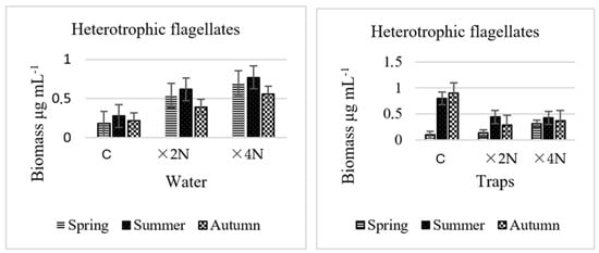 With the increase in fertility in successive experimental treatments in the water, the biomass of heterotrophic flagellates increased. In treatment ×4N in the water, the biomass of flagellates was higher (0.52–0.75 μg mL1) than in treatment ×2N (0.4–0.61 μg mL1). An increase in biomass was observed in both treatment ×2N and treatment ×4N (in water) in comparison with the control. With the increase in fertility in successive experimental treatments in the traps, the biomass of the heterotrophic flagellates was different (Figure 5).