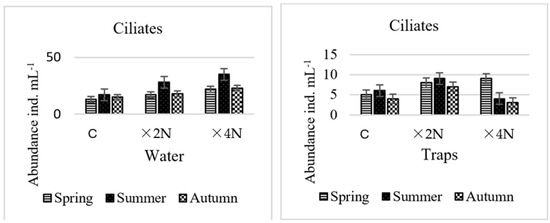The abundance of testate amoebae and ciliates was much higher in the water than in the traps of Utricularia vulgaris (in both ×2N and ×4N compared to the control sample) (Figure 6 and Figure 7). The abundance of testate amoebae and ciliates in treatment ×2N was highest in summer and lowest in spring. In treatment ×4N, the highest abundance of testate amoebae and ciliates in the water was observed in summer. In the traps, the highest abundance of both testate amoebae and ciliates in treatment ×2N was recorded in summer. In the traps, the highest abundance of both testate amoebae and ciliates in treatment ×4N was recorded in spring (ANOVA for testate amoebae F3.36 = 0.521, p = 0.511; ANOVA for ciliates F3.30 = 0.676, p = 0.512) (Figure 6 and Figure 7).
