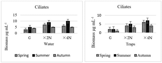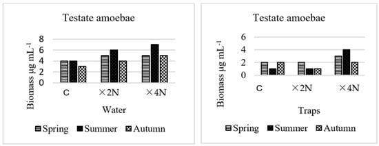 The biomass of testate amoebae and ciliates in the water mostly increased with fertility. The biomass of testate amoebae was highest in summer in both treatment ×2N and treatment ×4N in water (Figure 8) In the case of ciliates, the value for this parameter in both treatment ×2N and treatment ×4N was highest in the summer (Figure 9).