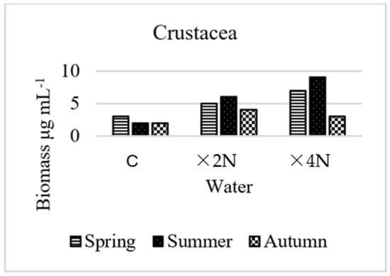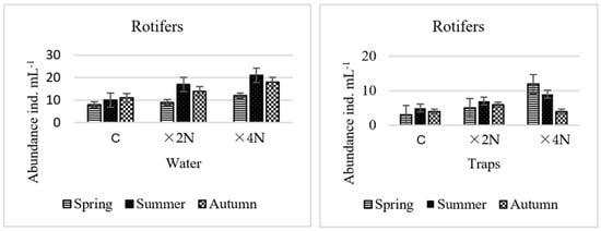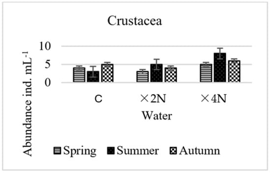 Crustaceans were not present in the traps. Their abundance in the aquatic environment was much higher in treatment ×4N (from 2 to 8 ind. mL−1). The highest abundance was noted in summer in both ×2N and ×4N (Figure 11).