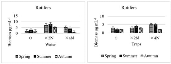 The biomass of rotifers in the water in treatment ×4N was lower than in treatment ×2N. Moreover the biomass of crustacea in the water in treatment ×2N was lower than in treatment ×4N—in spring and summer (Figure 12 and Figure 13). In the traps, the biomass of these organisms was higher in treatment ×4N—in spring and summer. The maximum biomass of rotifers in the water in treatment ×2N was 8 μg mL1, and the lowest biomass (5 μg mL1) was recorded in autumn. In the traps, the maximum biomass was 4 μg mL1, and the minimum was 3 μg mL1(Figure 12). In treatment ×4N, the highest biomass in the water was 5 μg mL1, and the lowest was 1 μg mL1. In the traps, the maximum value was 5 μg mL1, and the minimum was 2 μg mL1 (Figure 13).