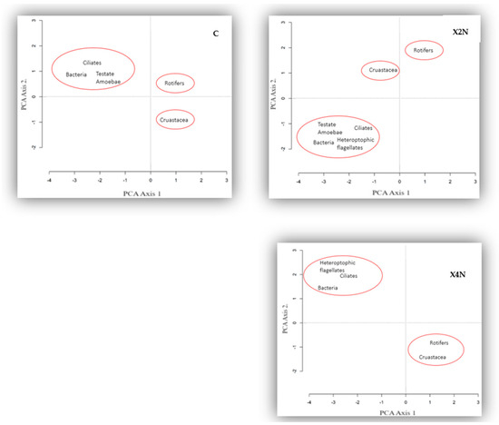 PCA analysis revealed a division of microbial communities into groups, differing in species composition in individual treatments. In the control sample, three groups were shown: the first consisted of bacteria, testate amoebae, and ciliates; the second comprised rotifers; and the third comprised crustaceans. In treatment ×2N, the microbial communities were formed by three main groups: the first consisted of bacteria, heterotrophic flagellates, testate amoebae, and ciliates; the second comprised rotifers, and the third comprised crustaceans. In treatment ×4N, there were two groups of microorganisms: the first consisted of bacteria, heterotrophic flagellates, testate amoebae, and ciliates, while the other comprised rotifers and crustaceans (Figure 14).