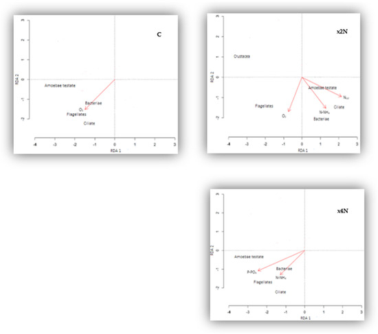 Redundancy analysis biplots showing communities of microbes and metazoa and environmental variables; C—control; ×2N—environment enriched with a twofold concentration of nitrogen compounds; ×4N—environment enriched with a fourfold concentration of nitrogen compounds); red arrows - relevant environmental variables.