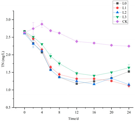 From the above, it can be observed that on the 16th day, the TN concentration in the L2 group was significantly lower than in the L1 and L3 groups (p < 0.05), and there was no significant difference compared to the L0 group (p > 0.05). At the full 24 days of the experiment, the total nitrogen concentrations of the L1 and L2 groups were significantly lower than those of the L0 and L3 groups, and there was no significant difference in the total nitrogen concentrations between the L1 and L2 groups (p > 0.05). On the 24th day, the total nitrogen removal rate of the L2 group was 12.95% higher than that of the L0 group. This indicates that the L2 group had a better TN removal effect than the other experimental groups. Thus, it is evident that a combination of V. natans and B. aeruginosa at a low or medium density has a more effective TN removal capability.