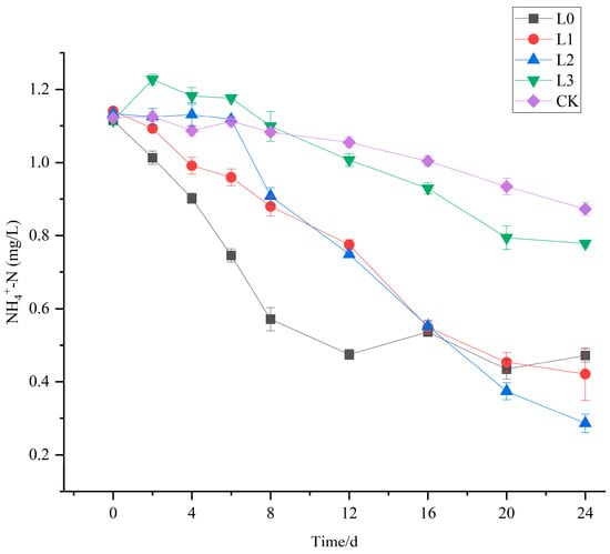 Figure 2 shows the purification results of NH4+-N in eutrophic water bodies by the configuration of V. natans and B. aeruginosa. As depicted, the NH4+-N concentration in the water bodies of all experimental groups generally showed a declining trend over time. In the CK control group, NH4+-N concentration slowly decreased to 0.873 mg/L, with a self-purification rate of 22.19%. The NH4+-N concentrations in the L1 and L2 groups gradually decreased, whereas in the L0 group, the NH4+-N concentration significantly decreased to 0.476 mg/L by day 12 (p < 0.05), performing better than other groups, but showed little change thereafter, and the purification of ammonia nitrogen removal rate at 24 days was 57.64%. Among these, the L2 group exhibited the best purification effect, with the NH4+-N concentration decreasing from 1.134 mg/L to 0.294 mg/L within 24 days, achieving a purification rate of 74.28%. The L3 group had the least effective purification, almost similar to the control group, where the NH4+-N concentration initially increased before decreasing.