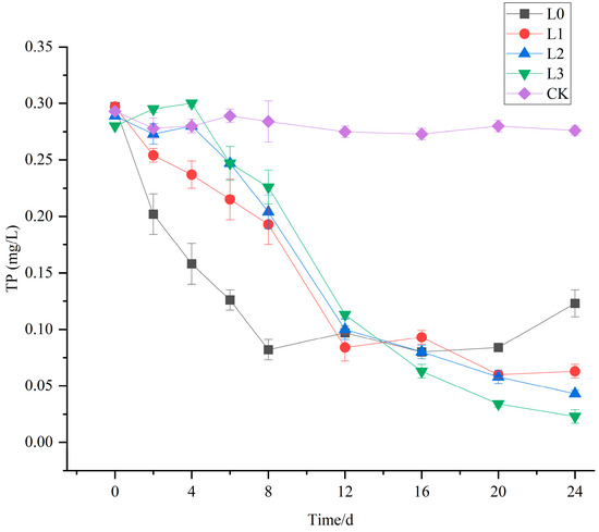 From these results, it is evident that the TP concentration in the L0 group decreased to the lowest within the first 8 days, but subsequently was significantly higher than the other experimental groups (p < 0.05). Over the 24 days, the TP purification rates of the L1, L2, and L3 groups progressively increased, and the total phosphorus removal rate of the L3 group was 33.19% higher compared to the L0 group, indicating that introducing B. aeruginosa helps reduce the TP concentration in water bodies, with higher densities yielding better results.