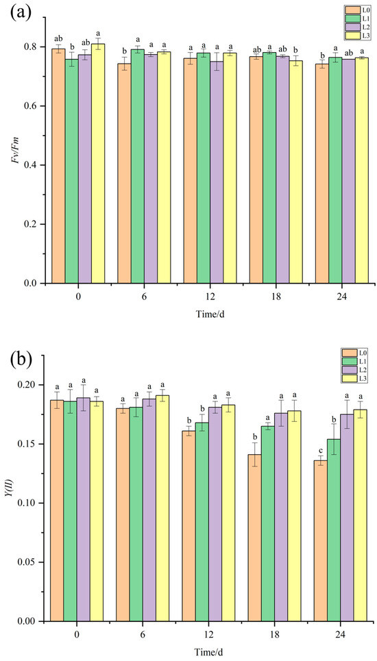 Figure 4 illustrates the changes in Fv/Fm and Y(II) of V. natans leaves under the configuration with B. aeruginosa. As shown in Figure 4a, there were no significant differences in Fv/Fm values between different experimental groups (p > 0.05). However, there was a general decline in Y(II) values (Figure 4b). On day 24, the Y(II) value of V. natans leaves in the control group decreased to 0.136, which was significantly lower than that in the experimental groups (p < 0.05), representing a decrease of 27.27% compared to day 0. In the L1 group, the Y(II) value on day 24 was 0.154, a decline of 17.20% compared to day 0. While there was a decrease in Y(II) in the L2 and L3 groups, it was not as pronounced, with the overall trend showing a decrease over time, more noticeably in groups with lower densities.