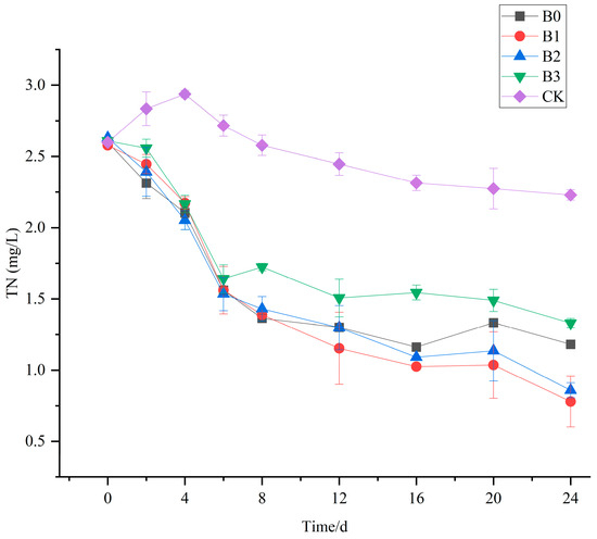 From these results, at 24 days, the total nitrogen concentration in the B1 group was the lowest, significantly lower than the B0 and B3 groups (p < 0.01), with no difference from the B2 group (p > 0.05), and the B3 group was significantly higher than the B1 and B2 groups (p < 0.01). It can be concluded that adding an appropriate density of H. cumingii to the V. natans and B. aeruginosa base helps in TN removal. However, an excessively high density of H. cumingii is counterproductive for TN removal.
