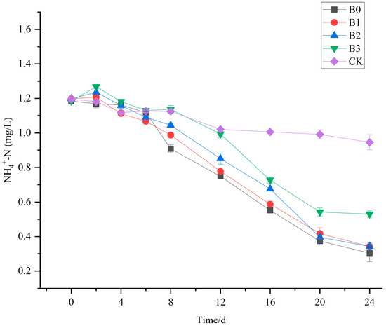 Figure 6 displays the results of NH4+-N purification under the configuration of V. natans, B. aeruginosa, and H. cumingii. As shown in Figure 6, the NH4+-N concentration in all experimental groups showed a decreasing trend, while the CK control group exhibited a slight decline, with NH4+-N concentration dropping to 0.883 mg/L by day 24, resulting in a self-purification rate of 25.92%. Comparatively, the B0, B1, and B2 groups showed better purification effects. There was a slight increase in NH4+-N concentration on day 2 (except for B0), followed by a gradual decrease, with NH4+-N removal rates of 74.34%, 71.45%, and 71.45% respectively, by day 24. In contrast, the B3 group showed a slower downward trend in NH4+-N concentration, with a removal rate of only 54.23% by day 24.