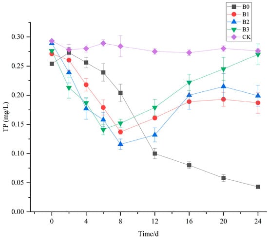 Figure 7 presents the results of TP purification under the configuration of V. natans, B. aeruginosa, and H. cumingii. As indicated in Figure 7, the TP concentration in the CK control group showed almost no decline, with a self-purification rate of only 9.22%. In contrast, the B0 group exhibited a continuous downward trend, achieving the best TP removal effect with a removal rate of 83.07%. For the B1, B2, and B3 groups, the TP concentration initially decreased and then increased. In the B1 and B2 groups, the TP concentration reached its lowest on day 8, with the lowest TP concentrations and purification rates being 0.137 mg/L at 49.45% and 0.116 mg/L at 59.86%, respectively. On day 20, the TP concentrations increased to 0.193 mg/L and 0.215 mg/L, respectively, and showed a slight decrease on day 24, with the lowest TP concentrations and purification rates being 0.187 mg/L at 31.00% and 0.199 mg/L at 31.42%, respectively. In the B3 group, the TP concentration decreased to its lowest at 0.141 mg/L on day 6, with a purification rate of 48.91%, and then continuously increased to 0.270 mg/L.