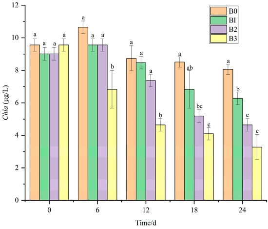 Figure 8 illustrates the changes in Chla concentration in water bodies within the V. natans, B. aeruginosa, and H. cumingii configuration systems. As shown in Figure 8, the Chla concentration in all experimental groups demonstrated a decreasing trend, with higher densities of H. cumingii leading to more effective Chla removal. In the B0 control group, the Chla concentration at 24 h was 8.055 μg/L, with a removal rate of 15.70%. The B3 group showed the best Chla removal effect, with a Chla concentration of 3.276 μg/L at 24 days, translating to a removal rate of 65.71%, which was significantly lower than the control group.