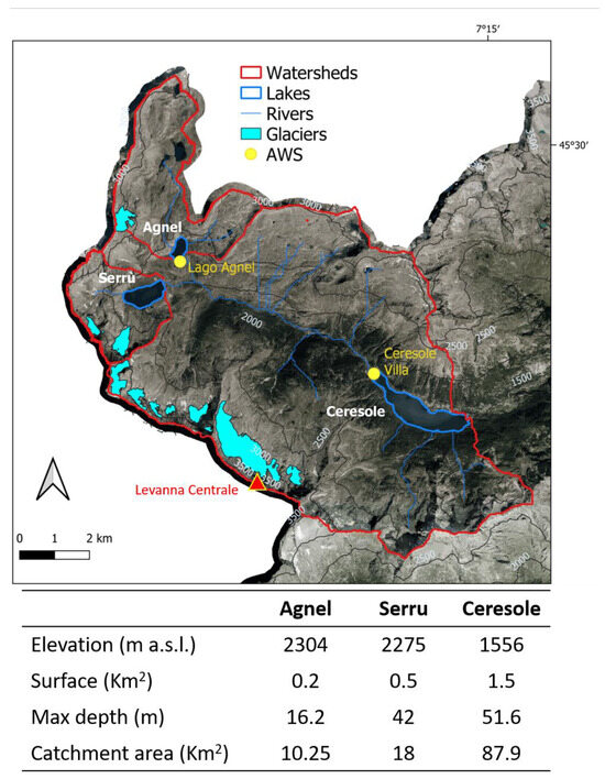Ceresole watershed (red line) with sub-basins for each reservoir. Yellow dots indicate the location of AWS stations used in this work. The base image is an orthophoto from the 2018 flight performed by Agenzia per le erogazioni in agricoltura (AGEA). The glacier surface (cyan) comes from the GLARISKALP Project. Catchment and max depth data are taken from the LIMNO dataset (http://www.vb.irsa.cnr.it/limno/, accessed on 25 February 2024).