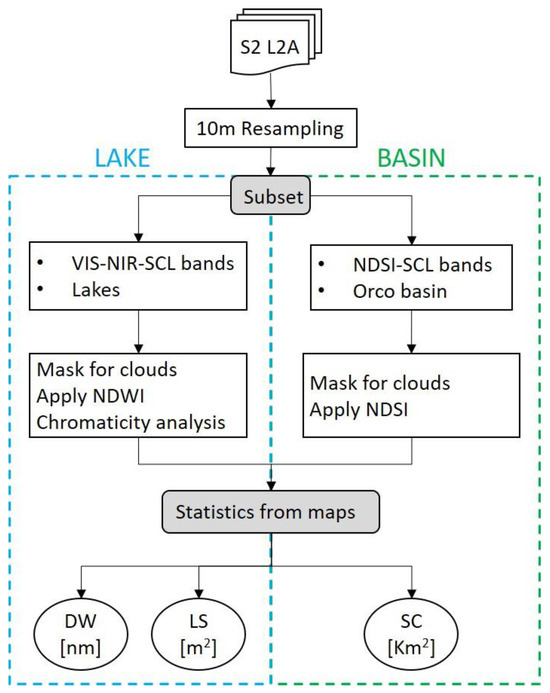 Lake water extent (Lake Size [LS]) and water colour (e.g., Dominant Wavelength [DW]) of Ceresole, Serrù and Agnel Lakes were retrieved from the elaboration of cloud-free (<30% over the tile) Sentinel-2 satellite acquisitions above the upper Orco Valley watershed in the period 2017–2022 (period of availability of atmospherically corrected S2L2 images in Google Earth Engine). The snow cover extent [SC] inside the basin was derived from the same images. The sketch of the elaboration steps is shown in Figure 2.