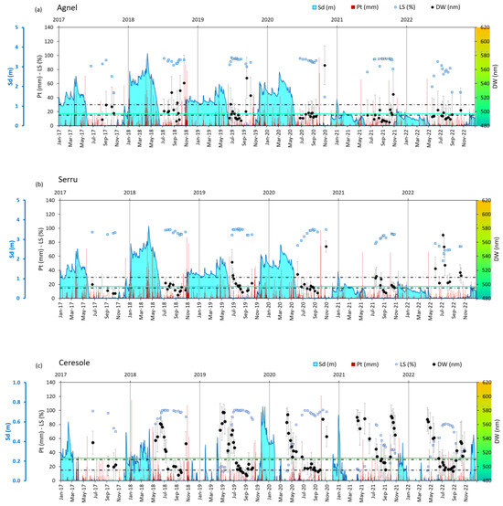 Water colour (DW, black dots) and lake size (LS, blue squares) series of Agnel Lake (a), Serrù Lake (b) and Ceresole Lake (c) for the 2017–2022 period. DW dotted bars represent the spatial standard deviation of DW inside the lake. LS are expressed in percentage (0–100) relative to the maximum area of the lake. Daily total precipitations (Pt, mm) are shown with red bars. Snow depth (Sd) is shown as cyan areas and refer to the third y-axis in blue. The average value of DW recorded over the five years is represented by a coloured horizontal line. The black dash dotted lines represent the blue–green (495 nm) and green–yellow (510 nm) thresholds by [14].